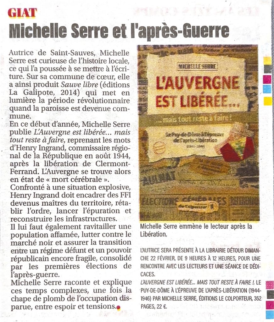 Un nouvel article consacré au documentaire de Michelle Serre, L’Auvergne est libérée… mais tout reste à faire !, est paru dans La Montagne du 18 février 2026. Il annonce également la séance de dédicaces prévue le 22 février à la librairie Détour de Giat (63).